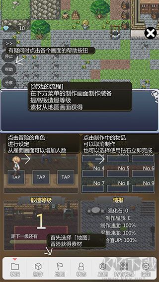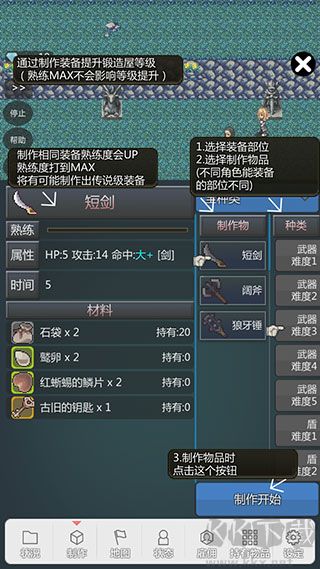 游戲流程如下:于下方菜單的制作畫面中制作裝備,同時提升鍛造屋等級,素材可從地圖畫面獲取。