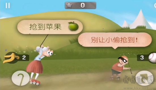所有關卡都有小賊一起跑酷,要搶在小賊拿走蘋果前收起,獲蘋果越多成績越好,全拿三個蘋果需實力。