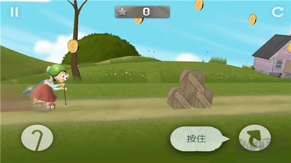3、矯健老奶奶形象有趣:右側的按鍵是跳躍鍵,短按能跳過短板或者箱子,長按的話老奶奶會在空中做個前滾翻再落地,而且摔倒后依然保持著帥氣迷人的姿態(tài)。這個設定讓老奶奶的形象更加生動有趣,增加了游戲的吸引力。