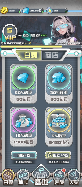 3、2D卡通畫風品質(zhì)較好,五頁簽布局在輕度游戲中常見到,UI充滿一種科技感。