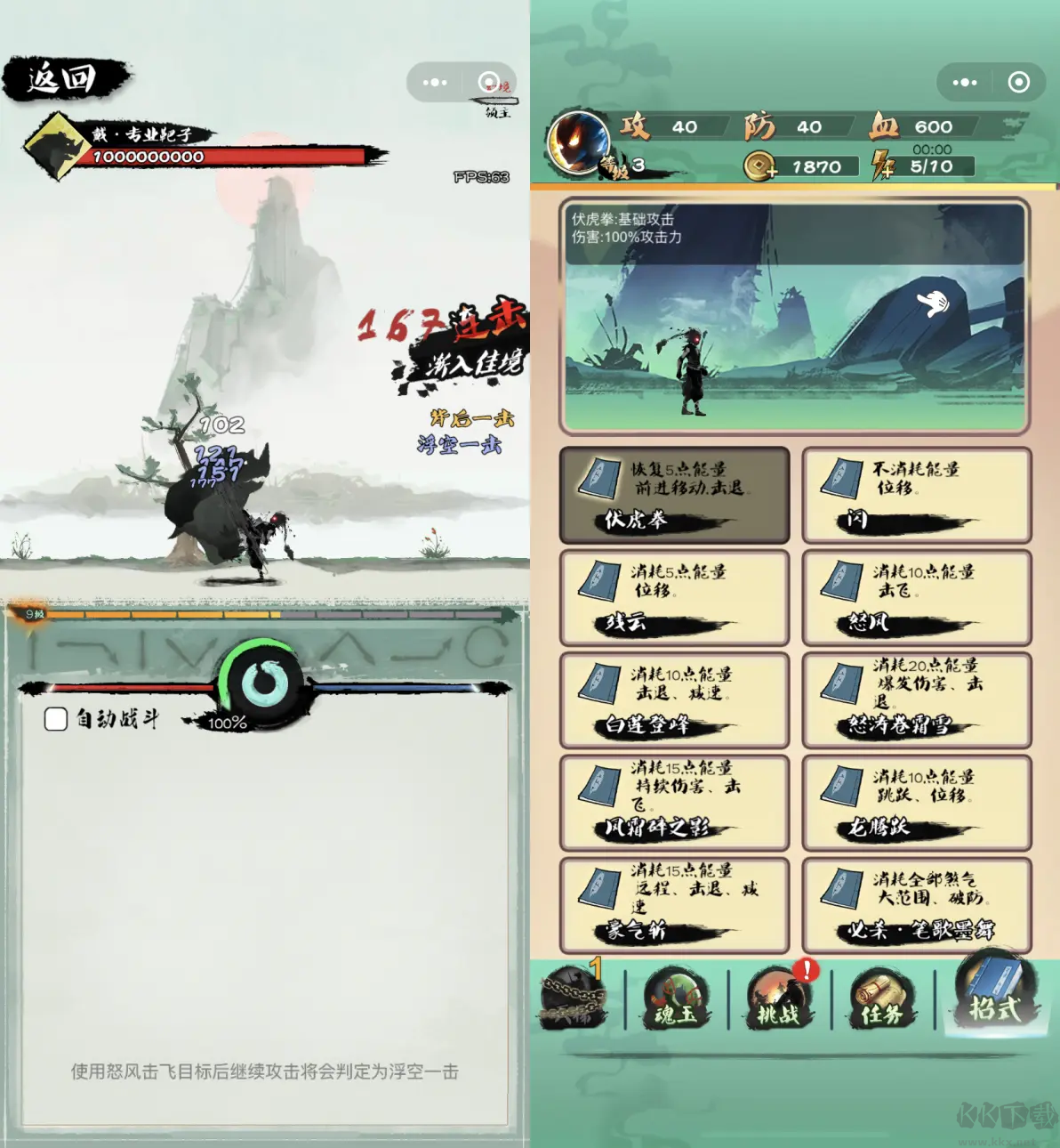一指功夫夢是一款水墨風格的橫板闖關(guān)格斗游戲。與其它的游戲相比起來,這款游戲足以用簡約來形容。除了主要的闖關(guān)玩法,就只有一個魂玉系統(tǒng)。雖說是簡約,但實際上它的玩法并不簡單。它最大的特點就是沒有傳統(tǒng)格斗游戲的諸多技能按鍵,甚至連方向鍵都沒有,只需要一根手指就可以操作。