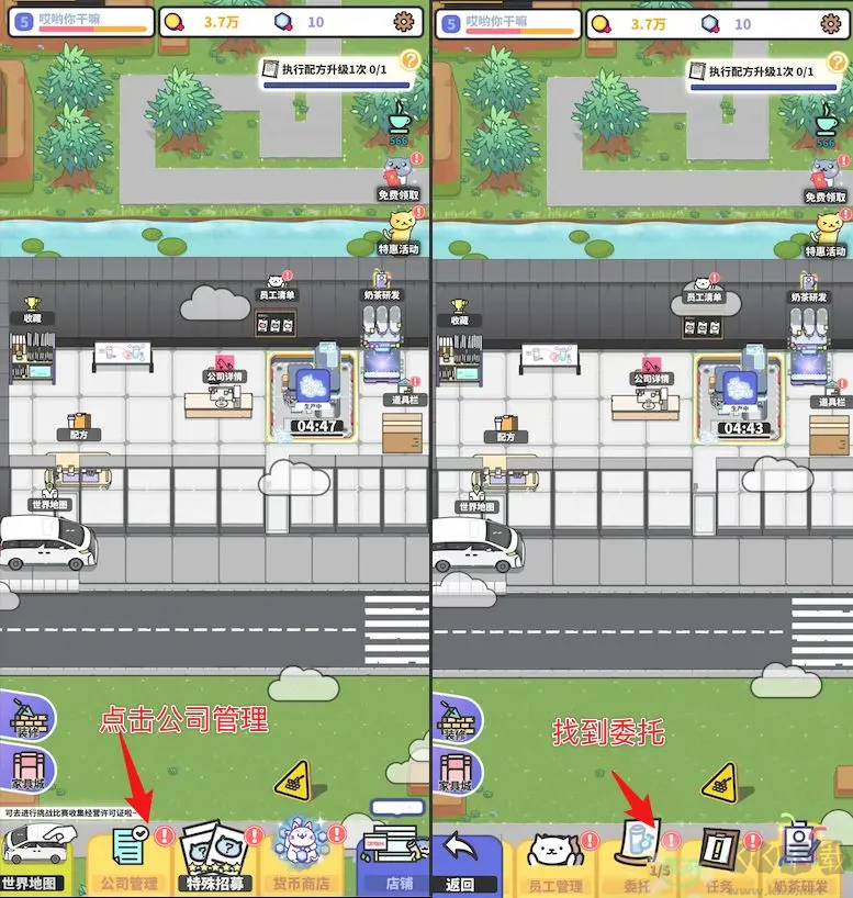 關(guān)于委托的話,很多人不知道委托在哪里,指路一下~委托在公司的左下角公司管理——委托。委托要的東西分為兩類,一是配方,二是材料。配方還要求口味等級,前期不建議提交,等到后期咱們不缺資源以后再把工作臺開滿就可以制作配方并提交~材料委托的話有富余材料的時候提交一些就好啦。前期推薦各位老板做這種材料委托。PS:委托是科技點的主要來源喲。