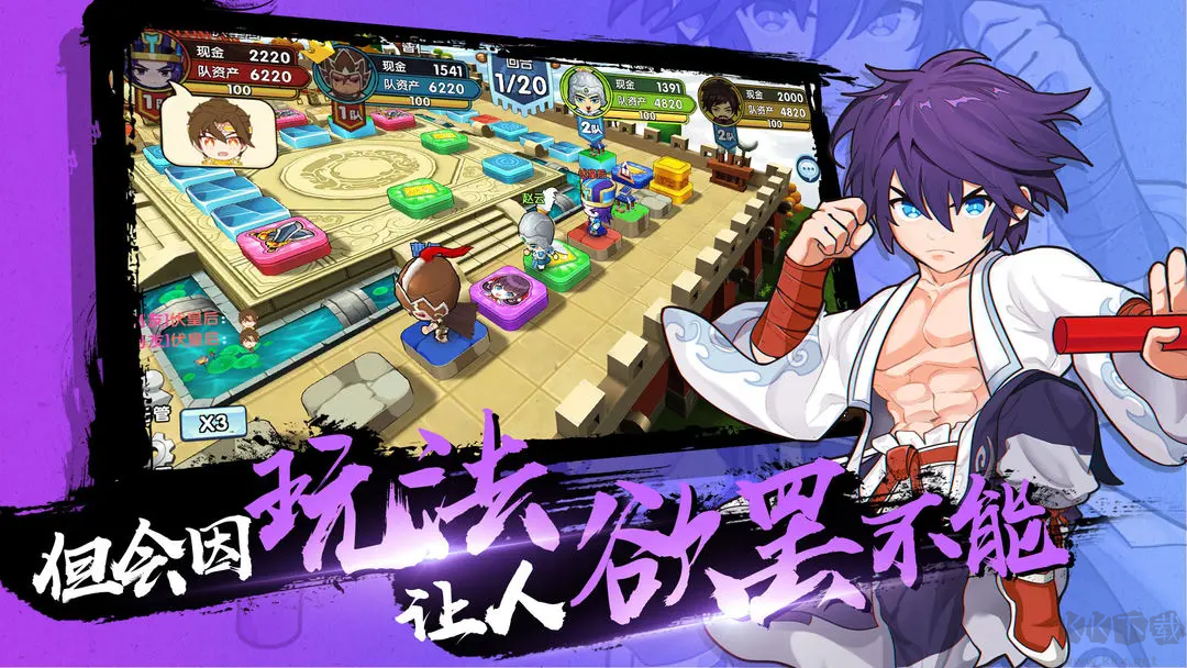 《富豪闖三國》是款名字略土但玩法出眾的大富翁類、三國題材原創(chuàng)劇情的3D手游,在傳統(tǒng)大富翁土地經(jīng)營玩法的基礎(chǔ)上,加入了卡片戰(zhàn)斗,卡片合成,房屋建造,運氣酒館,角色必殺等玩法??蓡稳诉^關(guān),也可以組隊打BOSS,或在線PK。