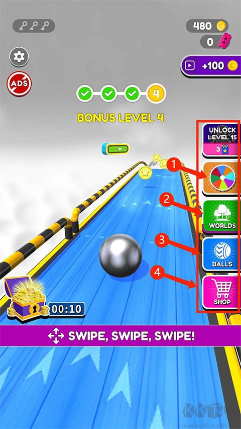 3、開始向前滾動,在通向終點的過程中,應(yīng)盡可能獲取金鑰匙及金幣,
