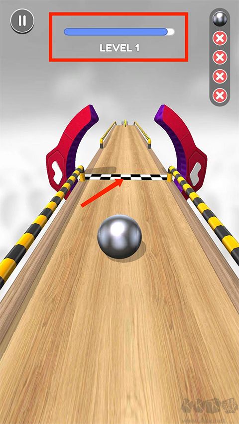 4、如附圖所示,在兩側(cè)無圍欄以及遭遇障礙物時,請放慢速度。否則,若球掉出通道,將消耗一次游戲機會,