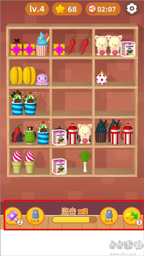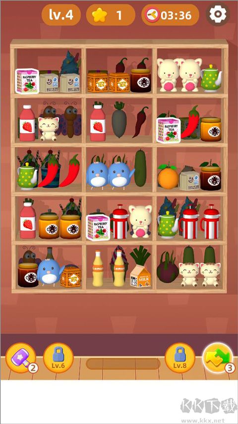 2、進(jìn)入后需找出相同物品,并將其放置在同一個(gè)貨架上以實(shí)現(xiàn)消除操作。