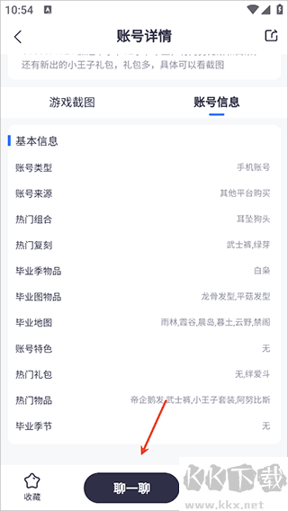 4、若需對交易流程或游戲賬號信息作進一步了解,可點擊【聊一聊】,與交易對方進行更深入的溝通。