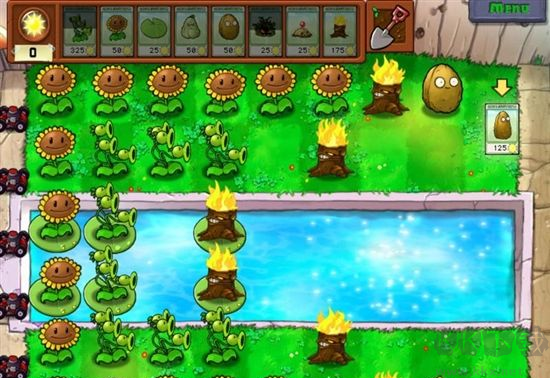 要點(diǎn)1:經(jīng)濟(jì)作物向日葵,水上必須放蓮蓬,水路最后4格不會(huì)突然冒出僵尸,如果水上有鋼帽子僵尸,此時(shí)你水路火力還薄弱,可以用墻國(guó)擋,也可以用25YG的海藻消滅