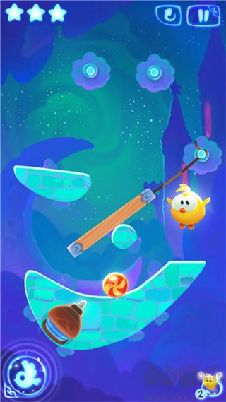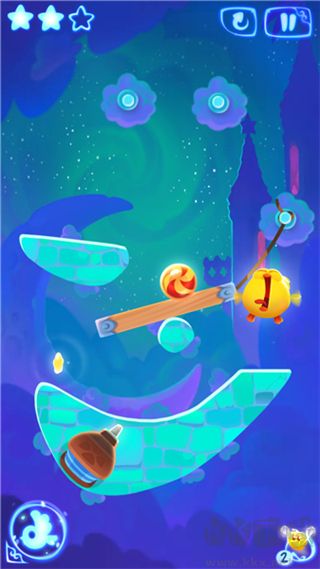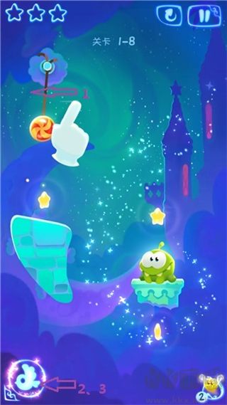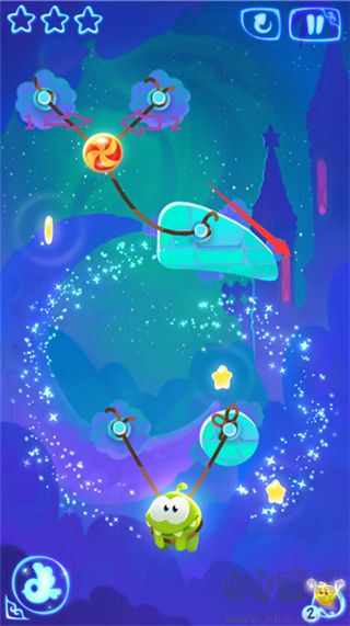 首先,割斷繩子,接著改變主角形態(tài),獲取其頭頂上方的星星。之后,將主角恢復(fù)至原來狀態(tài),糖果便會順著流動(dòng)的星河順利進(jìn)入主角口中。