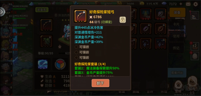 2. 套裝,好奇探險家必定留三套!除了正常刷秘境以外,剩下的時間就穿著好奇套刷低級秘境。有金有藍綠裝,正好給強化。好奇套4條屬性中,第3和第4條一定去洗出加金幣加魔法裝備的,如圖。