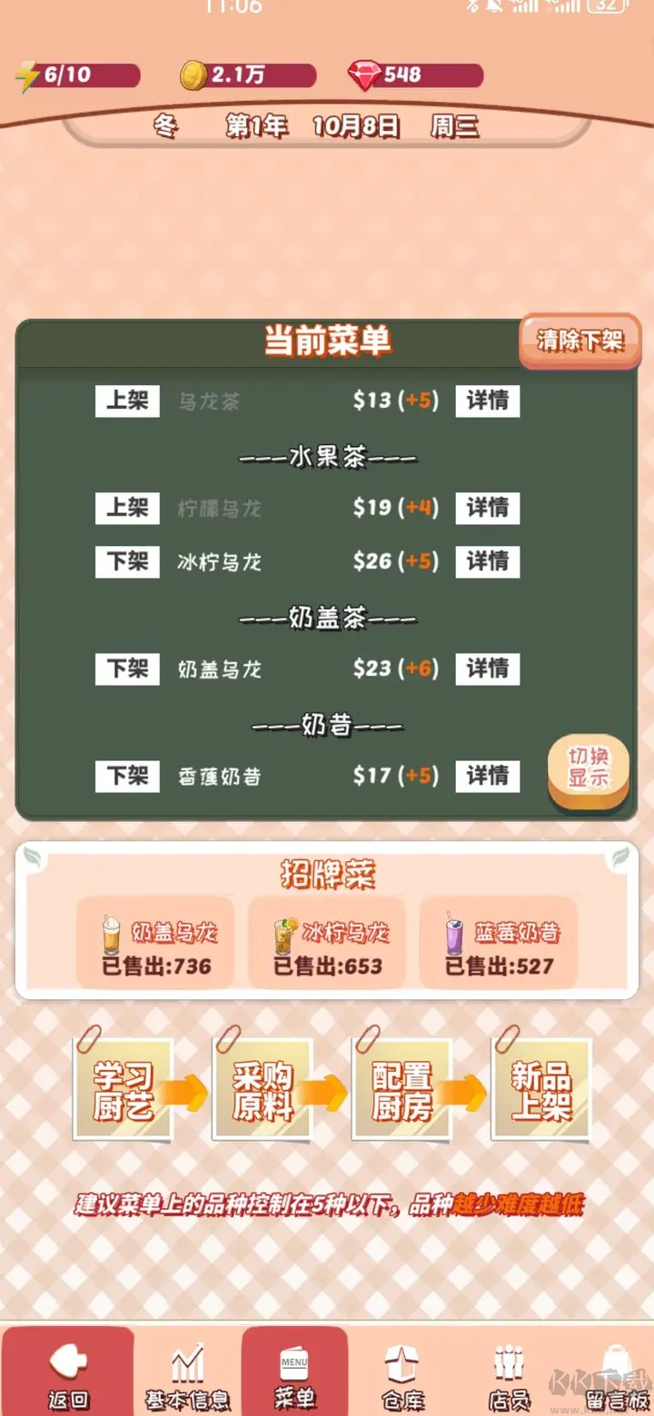 可以調(diào)整隊(duì)列,這樣一局就能把所有的客人都招待完,考驗(yàn)手速,做菜。所以最好只做三個(gè)菜,且三個(gè)菜要把所有物品都用上(冰塊,奶蓋,配料)