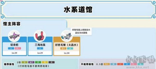 4、水系道館:30 級,玻瓶鎮(zhèn)海岱守館,30 級好勝毛蟹,勿用草貓,電系咩利羊可勝。