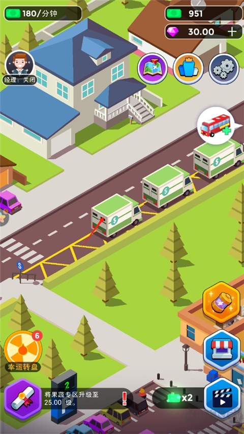 剛進(jìn)入游戲我們只有一個(gè)果蔬專區(qū)、一個(gè)收銀員,而且收銀的速度也非常的慢,這個(gè)時(shí)候就需要玩家進(jìn)行升級(jí)了;