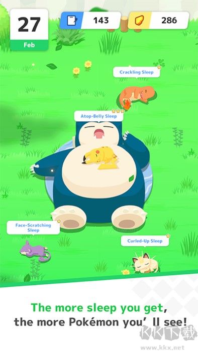 在我們玩的版本中,有超過(guò)100個(gè)神奇寶貝可以被發(fā)現(xiàn),每個(gè)神奇寶貝至少有3種不同的睡眠方式,并有不同的星級(jí)來(lái)表明它們的稀有程度;睡眠質(zhì)量越好,Snorlax的困倦力越高,找到罕見睡眠方式的機(jī)會(huì)就越大。