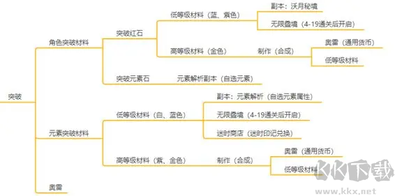 階段性的突破則需要角色突破材料,與角色所對(duì)應(yīng)元素的突破材料來完成。其中低等級(jí)材料從副本即可大量獲得,而高等級(jí)材料需要通過低等材料的合成來獲取。這些材料的獲取途徑見下方: