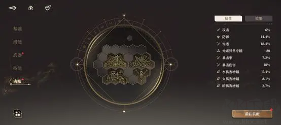 古痕可以理解為身體附魔,可以為角色提供的屬性加成是以百分比形式展現(xiàn),并伴隨著不同元素傷害的增幅與元素異常專精,可以從基礎(chǔ)面板查看有古痕加成后的各項(xiàng)數(shù)值。