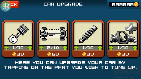 至于場(chǎng)上能夠獲得的物品除了火箭推進(jìn)道具、金幣、汽油之外,寶箱也是相當(dāng)重要的一個(gè)收集目標(biāo),不僅可以獲得更多的金錢,同時(shí)也可以滿足某些玩家的收集欲望,就好比許多闖關(guān)作品中的星星收集一樣,那種成就感或多或少地給游戲起到了積極作用。而使用獲得的金幣可以對(duì)車子的爬坡、生命值、加速、儲(chǔ)油量等能力進(jìn)行提升,價(jià)格上確實(shí)非常厚道,至少能力的提升可以跟上難度前進(jìn)的步伐。