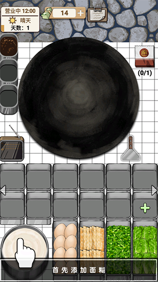 4、煎餅翻面動(dòng)作:雞蛋攤平后,點(diǎn)擊鏟子滑動(dòng)煎餅側(cè)面,迅速翻轉(zhuǎn)至另一面朝上。