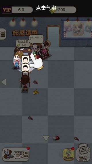 3、前期準(zhǔn)備完成,便進(jìn)入營(yíng)業(yè)階段。顧客通常會(huì)想好發(fā)型,點(diǎn)擊顧客頭上的氣泡,理發(fā)師就會(huì)前去服務(wù)。