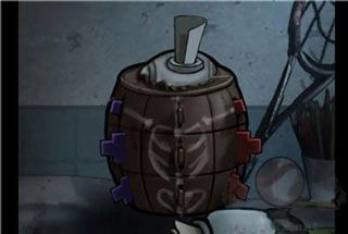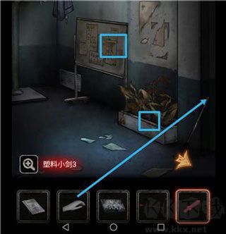 13、用癢癢撓和鋼絲球在排風(fēng)扇處獲塑料小劍 3,于指定位置收集 1、2 部件,拼接成拐杖。