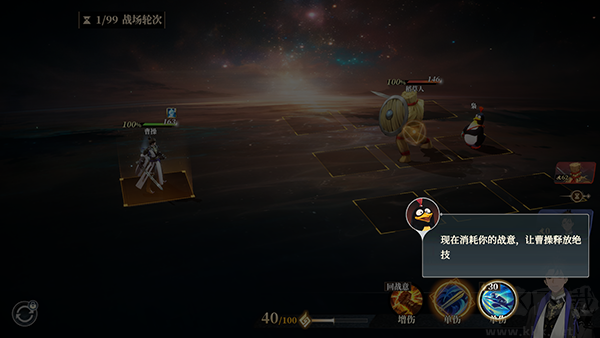 3、界面最下方的戰(zhàn)意值至關(guān)重要,其數(shù)值決定武將大招能否釋放。