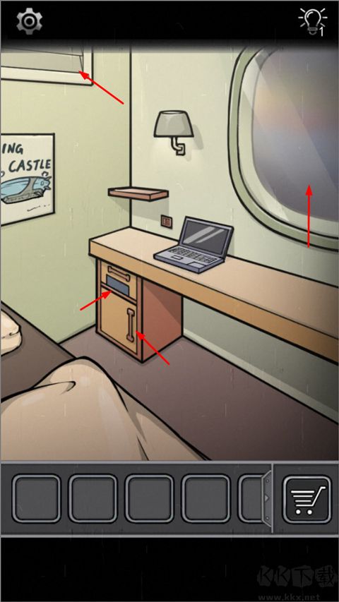 抽屜上有英文字母密碼,上面標(biāo)有1579,點(diǎn)窗戶,看到機(jī)翼上的英文FLYING CASTELE,得到FNCS,打開抽屜,得螺絲刀,用螺絲刀打開通風(fēng)口。