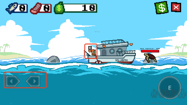 2、前往最左邊的釣魚臺,點(diǎn)擊E開始釣魚。釣魚線會(huì)自動(dòng)下降;使用左右方向鍵來控制它的方向。用魚鉤撞擊一條魚,對它造成傷害,傷害足夠后將它釣上來。