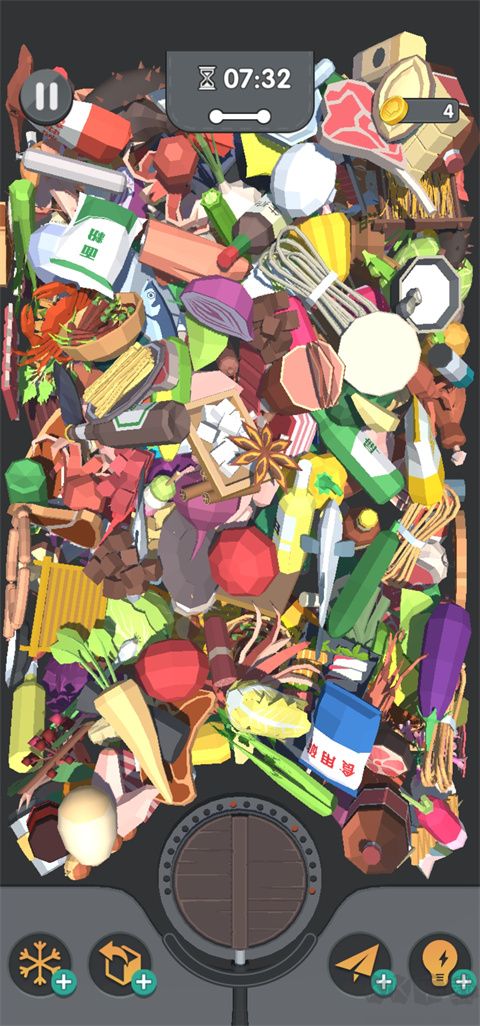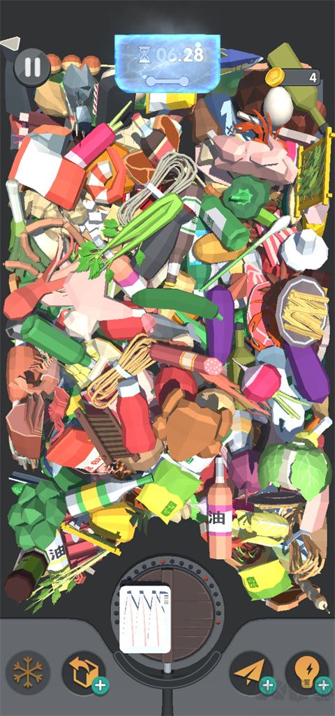 6、關(guān)卡設(shè)有時(shí)間限制,需在時(shí)長(zhǎng)內(nèi)完成所有物品消除,可使用道具輔助;