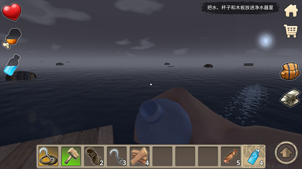 1、開局用鉤子收集資源,不漏木桶,勾不到可下水撈,先造杯子和煮水器,再造爐子和魚竿。?