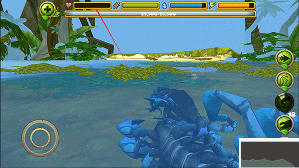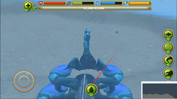 1、進(jìn)入體驗后,將化身一只蝎子;左側(cè)控制移動,右側(cè)按鈕從上至下依次為加速、眩暈、尾刺攻擊、鉗子攻擊、進(jìn)食。