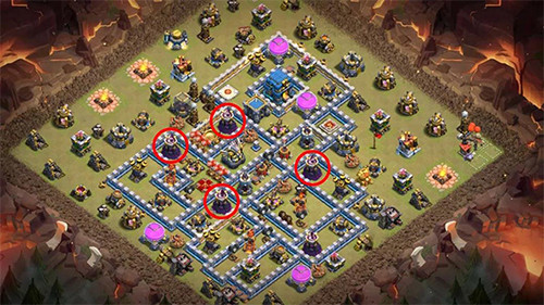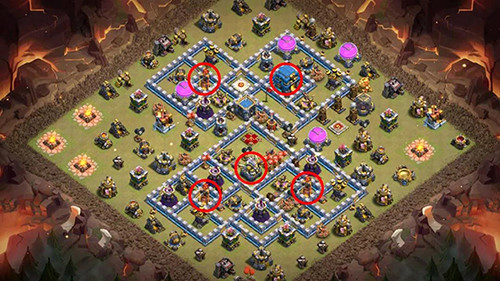 陣型以天鷹火炮和部落城堡為核心,多頭地獄塔圍繞核心區(qū)域組成防御區(qū)。防空邊置,對(duì)空軍流派也有不錯(cuò)的防御效果。