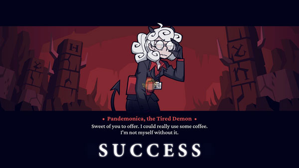攻略:關(guān)卡VIII,攻略時(shí)與「地獄女皇」路西法對(duì)話中,第一次選擇選項(xiàng)2「不,謝謝。但是您可以加入我的后宮」,第二次選項(xiàng)選擇2「我可以提供咖啡,回合制策略及巧克力煎餅?!?,即可獲得。