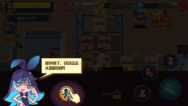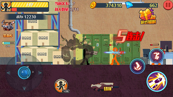 1、玩家要控制火柴人不斷的跳躍躲避敵人的子彈,然后通過強大的火力壓制敵人;
