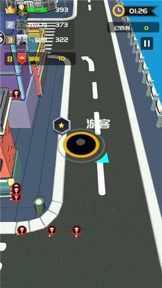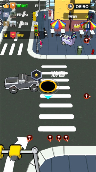 4、手指滑動(dòng)屏幕上方的位置移動(dòng)黑洞來吞噬比自己小的物體,讓自己變得更加強(qiáng)大,從而能吞噬更大物體,比如先吞噬路燈、人、椅子、樹木,等到變大之后再來吞噬房屋、車輛等;