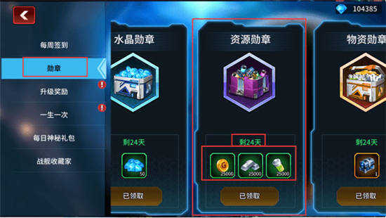 第一、是我們必買的勛章,這里每天可以領(lǐng)取到的物資是性價比最高的一個勛章,每天可以獲取到各2.5W的資源