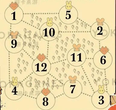 右上角②號(hào)位置是常見(jiàn)的貓咪開(kāi)局,原因的兩個(gè)空槽對(duì)貴族誘惑較大,但外圍的⑤⑩⑥號(hào)位置不相連,四面受敵,處境險(xiǎn)惡。