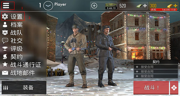 1、首先進入世界戰(zhàn)爭英雄游戲,然后登錄進入下圖界面,在左上角有三杠標志,選擇設置;