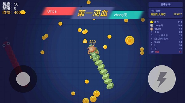 長(zhǎng)按加速,用巧妙的走位讓蛇身被別人撞上,就可以吃掉對(duì)方收集的金幣迅速變長(zhǎng)。