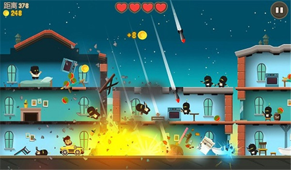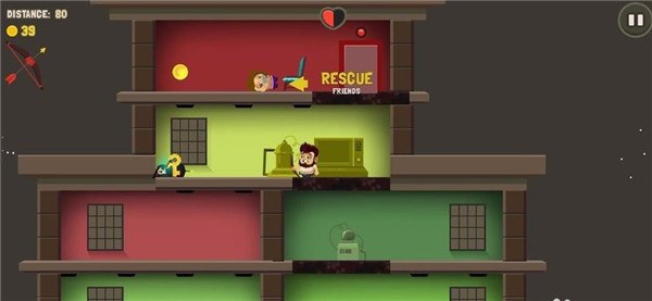 游戲讓每個人都體驗到了只需要一只手就能感受到猛烈沖擊的快感。一開始,貼心的新手教程足以讓玩家一目了然。只需上下滑動屏幕,就可以控制大胡子上下跳來跳去,在各個樓層之間來回沖擊,在躲避敵人攻擊的同時攻擊敵人拯救人類。
