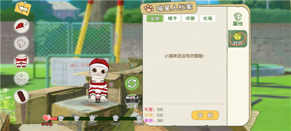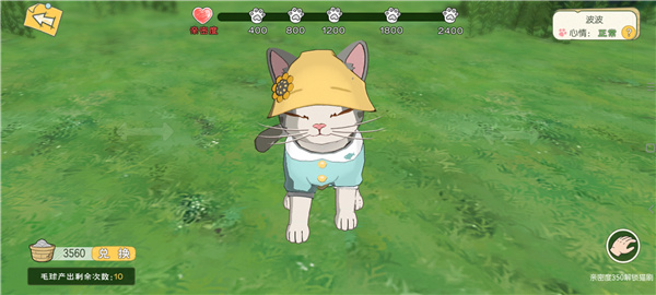 放置好貓咪后靠近貓咪,會出現(xiàn)互動和換裝。選擇互動可以增加和貓咪的親密度,還有機會獲得毛球。選擇換裝可以對貓咪進行裝扮,貓咪的服飾可以在寵物店用毛球兌換。