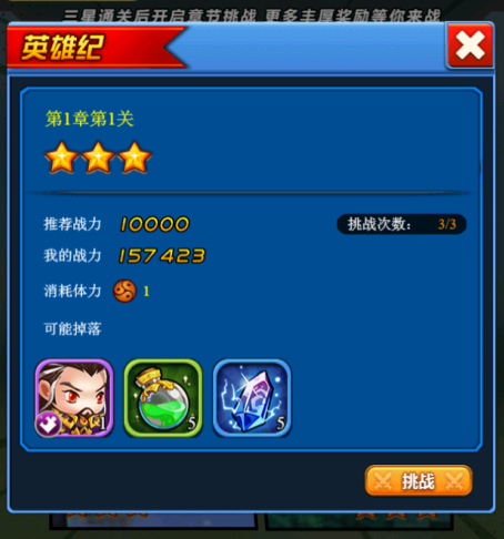 通過挑戰(zhàn)章節(jié)關(guān)卡獲得此章節(jié)所代表的相關(guān)人物碎片;在挑戰(zhàn)的時(shí)候會(huì)有推薦戰(zhàn)力的提示,讓你輕松知道通關(guān)條件。每挑戰(zhàn)一次耗費(fèi)一點(diǎn)體力,一共10點(diǎn)體力值,每小時(shí)回復(fù)一點(diǎn),所以一定要優(yōu)先刷你主要培養(yǎng)的英雄碎片噢。當(dāng)然你要是個(gè)收集癖的話就各種挑戰(zhàn)吧!