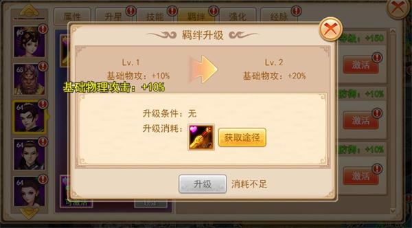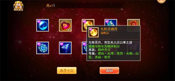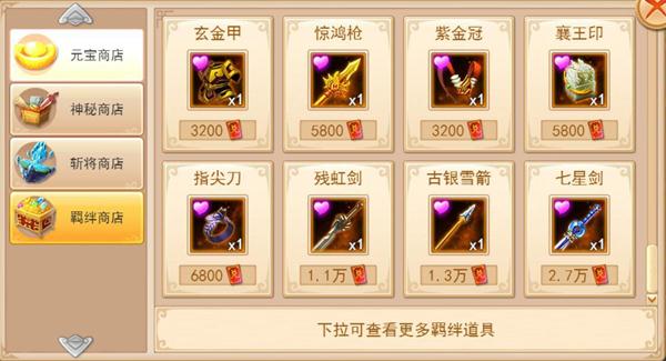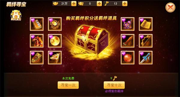 此外,玩家在尋寶的時(shí)候,也會(huì)有一定幾率得到羈絆積分和羈絆之心。前者可以在羈絆商店中兌換自己武將心儀的法寶,而后者則是作為法寶升級(jí)的唯一資源材料;