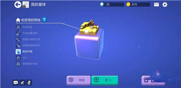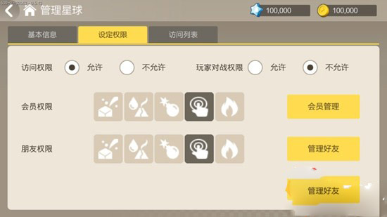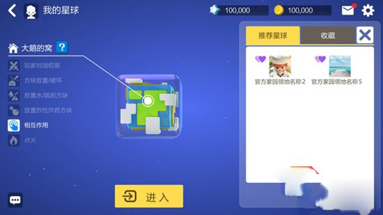 3、選擇地形后還可以更改星球的名字,這個隨你喜好咯!安置完畢后,還可以設置是否邀請小伙伴來家中做客。擔心熊孩子?沒關系,可以設置是否允許相互傷害、破壞。所以不用擔心你不在線的時候家園被破壞