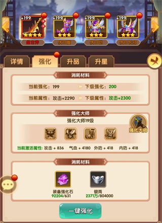 2、在強(qiáng)化界面有一個(gè)強(qiáng)化大師,裝備每強(qiáng)化10級(jí),強(qiáng)化大師升一級(jí),升級(jí)強(qiáng)化大師會(huì)激活裝備的屬性,提升戰(zhàn)力。