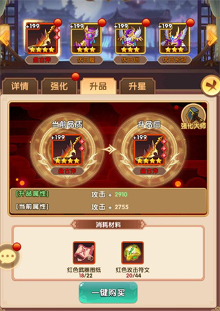 3、除了強(qiáng)化外,裝備還可以通過(guò)升品來(lái)提升品質(zhì),用圖紙和符文升級(jí)裝備顏色,都會(huì)提升裝備屬性。裝備除了以上的強(qiáng)化,升品還有升星也是對(duì)屬性提升巨大的。