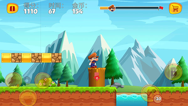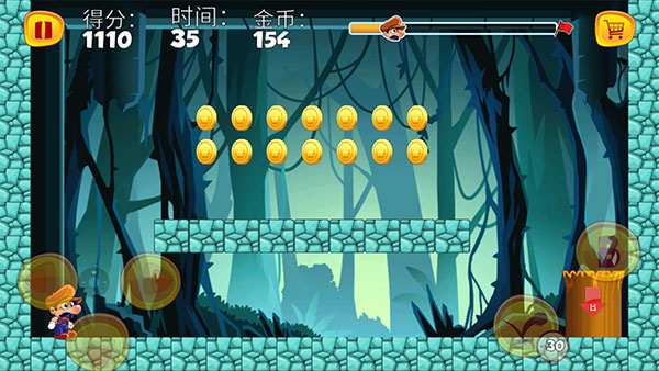 4、以第一關(guān)為例,左下角按鍵控制角色前進(jìn)后退和下蹲,右下角為子彈,發(fā)射會(huì)消耗金幣,B代表跳躍,連續(xù)點(diǎn)擊可以跳的更高哦。