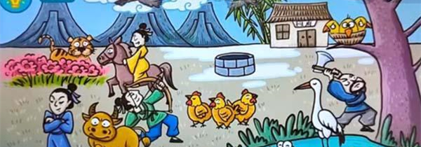 點擊后面的山出現(xiàn)東山再起,點擊云會出現(xiàn)閃電,然后將五個閃電拖動到房子上面出現(xiàn)五雷轟頂,點樹上中間的那個鳥出現(xiàn)笨鳥先飛,將砍樹的人放在房門前面出現(xiàn)班門弄斧,將白鶴拖動到雞群里面出現(xiàn)鶴立雞群,將青蛙拖動到水井里面出現(xiàn)井底之蛙,點擊河邊的草出現(xiàn)打草驚蛇,將蛇的尾巴拖動到老虎的尾巴上出現(xiàn)虎頭蛇尾,點擊男人的鼻子出現(xiàn)嗤之以鼻,把房屋旁邊的竹子放在男人的身上出現(xiàn)胸有成竹,然后一直點擊牛,當牛出汗的時候?qū)⑵渫蟿拥轿葑永锩娉霈F(xiàn)汗牛充棟,點擊馬尾巴出現(xiàn)走馬觀花,將右上角的蜘蛛網(wǎng)放到馬蹄印上面出現(xiàn)蛛絲馬跡,點擊天上飛行的大雁,出現(xiàn)雁過拔毛,當天上的老鷹重疊的時候點擊弓箭出現(xiàn)一箭雙雕;