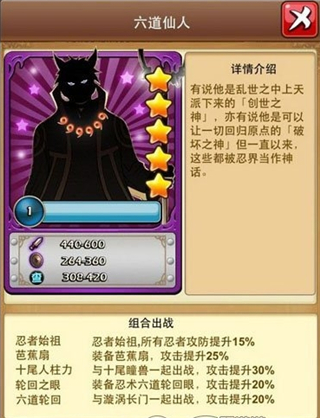 2、六道仙人,原著傳說中的角色,忍者的鼻祖,也算是最接近神的人物,他在《火影大人》中是張可遇不可求的卡牌,看他的屬性就知道了,相比其他卡牌絕對是最高 的。同時咱們來看看他的組合介紹,忍者始祖——所有忍者攻防提升15%...就算是高富帥恐怕也要三顧茅廬才能請得動這位頂級保鏢。