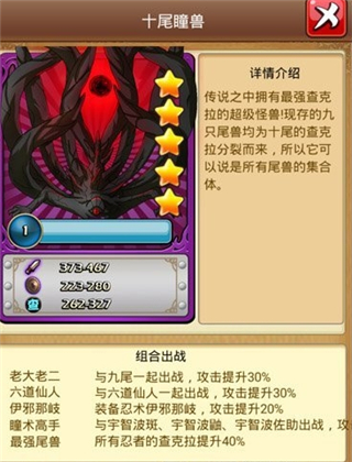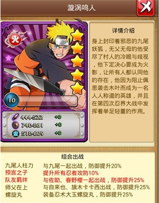 3、同時,這讓我們又悟出一個道理:能給全體忍者加屬性的卡牌都是好卡牌!《火影大人》平民玩家最容易得到的增加全員攻防的五星忍者就是“漩渦鳴人”,這個在 累計登陸后便可免費得到,并且他的組合也較好搭配,強烈建議作為主力卡牌。其他增強全員攻防加成的卡牌還有仙之鳴人、宇智波斑、千手柱間、三代雷影,而尾 獸不包括一尾、二尾則可以增加查克拉加成。一尾、二尾:我靠這赤裸裸的歧視啊,尾巴少不代表就弱?。?br />