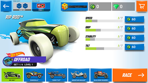 3、該界面顯示了我們將要駕駛的賽車(chē),點(diǎn)擊下方的賽車(chē)圖片即可切換,也可以在右邊進(jìn)行升級(jí),準(zhǔn)備好之后,點(diǎn)擊右下角的【RACE】按鈕。